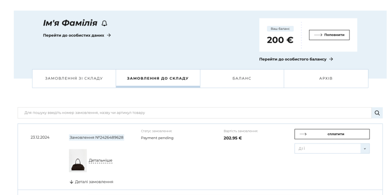 <p>Після оплати ми викуповуємо ваше замовлення та очікуємо його доставки на наш склад. Зазвичай це займає до 15 робочих днів. Якщо товару не буде в наявності, оплата повернеться на баланс вашого особистого кабінету.</p>