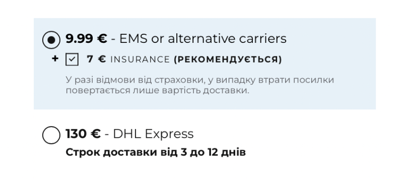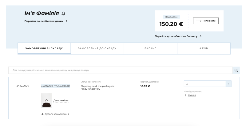 <p>Ми зберігаємо ваш товар на нашому складі протягом 6 місяців. Протягом цього часу ви можете оформити доставку з нашого складу до вашого дому. Після оплати доставки до вас ми надамо вам трек-номер. Підготовка посилки до відправлення займе не більше 24 годин. Вартість доставки можна переглянути, натиснувши на «детальніше».</p>